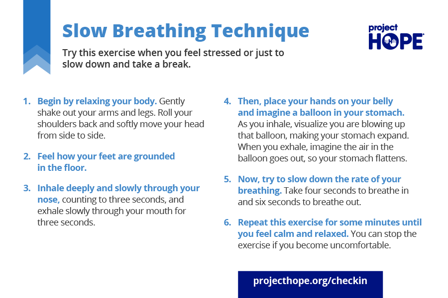 • Inhale deeply and slowly through your nose, counting to three seconds, and exhale slowly through your mouth for three seconds.