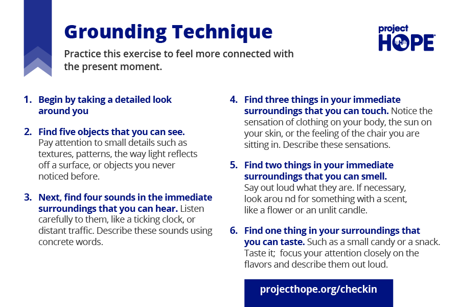 When experiencing anxiety, flashbacks, or worries, it can be helpful to direct your attention to the present moment to detach from unpleasant emotional distress. Although this technique doesn’t solve the underlying problem, it can provide relief and empowers us to gain control over our thoughts and feelings, preventing them from getting worse.