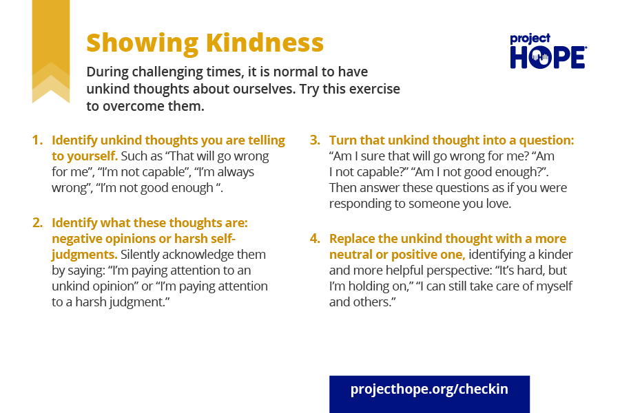 It is important to be kind to ourselves. Self-compassion empowers us and makes us feel better. During challenging times, it is normal to have unkind thoughts about ourselves, but we shouldn’t let them take over. Try this exercise to deal with them: