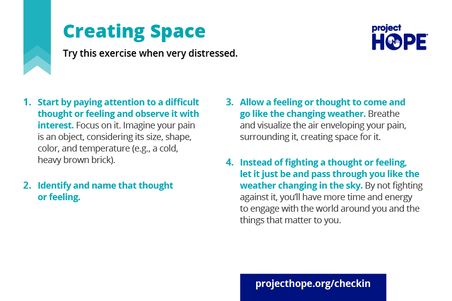 Sometimes it’s hard to push away difficult thoughts and feelings. In those moments, try a different approach: create space for them using this metaphor. Imagine your thoughts and feelings as if they were the weather and you were the expansive sky. No matter how harsh the weather is, the sky always has room for it, and the weather can never harm the sky. Sooner or later, the weather changes and our feelings do, too. We can learn to be the sky for the “bad weather” of our thoughts, without being harmed by them.